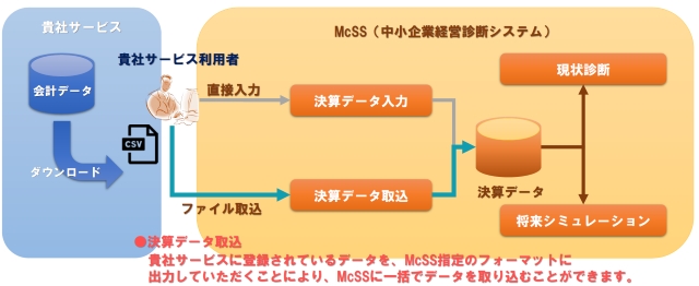 貴社が提供する会計ソフト等に、当該決算データファイルの出力サービスを追加していただきますと、McSSの経営診断機能との連携により、貴社サービスの付加価値を更に高めることに繋がり、ユーザー様の満足度向上やご利用拡大が期待できます。