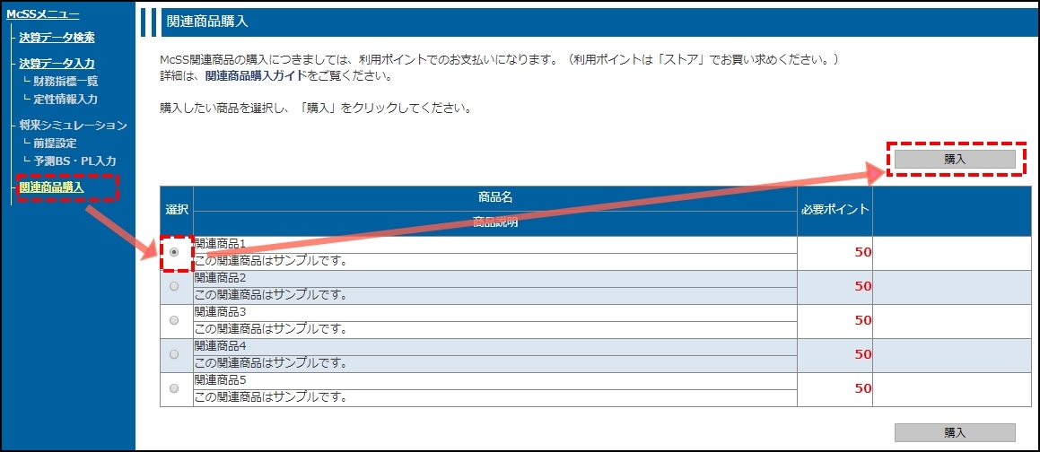 • McSSへのログイン後、サイドメニューの「関連商品購入」をクリックします。