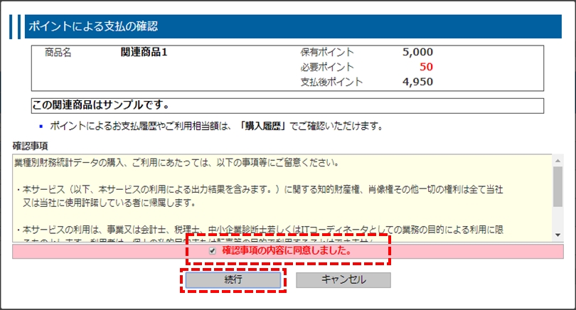 • 「確認事項」に同意いただける場合には、チェックを入れ、「続行」をクリックします。