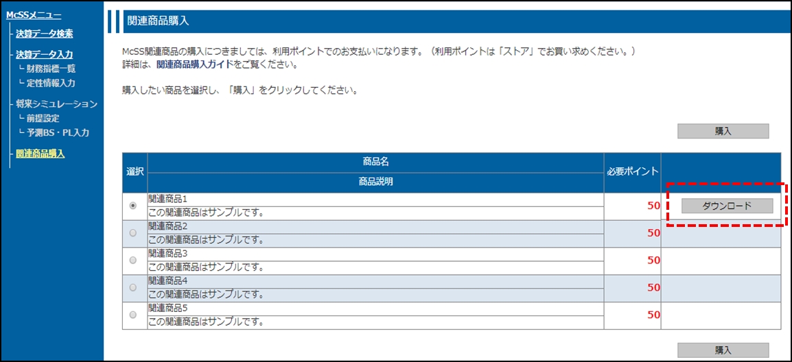 関連商品は、McSS(中小企業経営診断システム)へのログイン後、「関連商品購入」ページでお買い求めいただけます。関連商品の購入につきましては、利用ポイントでのお支払いになります。(関連商品は利用ライセンスが無くてもお買い求めいただけます。)