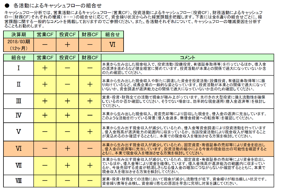 営業CF・投資CF・財務CFの『+・-』の組合せ8通りに応じたコメントを表示します。