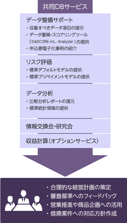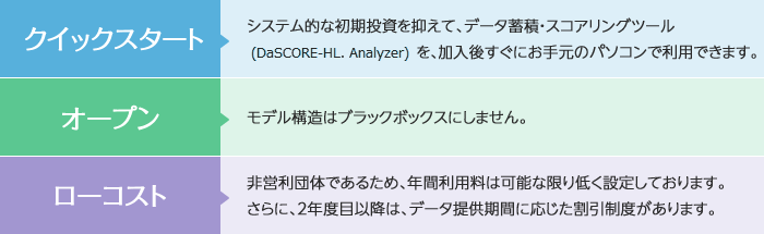 共同DB参加会員の皆様には、データ整備サポートとリスク評価サポート用のツールとして、DaSCORE-HL. Analyzer(データ蓄積・スコアリングツール)をご提供いたします。このツールを活用することで、自機関内の各種データの蓄積が可能となるほか、リスク評価面では提供モデルを活用して、将来にわたるデフォルトリスク予測や繰上げ返済リスク予測を行うことができます。 その他、分析機能が充実しており、ポートフォリオ集計や簡易な収益計算を行うことができます。